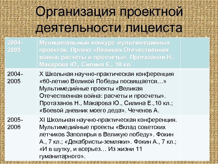 Организация проектной деятельности лицеиста 20042005 Муниципальный конкурс мультимедийных проектов. Проект «Великая Отечественная война: расчеты и просчеты» . Протазанов Н. , Макарова Ю. , Силина Е. , 10 кл. 20042005 X Школьная научно-практическая конференция « 60 -летию Великой Победы посвящается…» Мультимедийные проекты «Великая Отечественная война: расчеты и просчеты» . Протазанов Н. , Макарова Ю. , Силина Е. , 10 кл. ; «Боевой дневник моего деда» . Чеченов А. 20052006 XI Школьная научно-практическая конференция. Мультимедийные проекты «Вклад советских летчиков Заполярья в Великую победу» . Фокин А. , 7 кл. ; «Декабристы-земляки» . Фокин А. , 7 кл. ; «И в шутку, и всерьез… Из жизни 11 гуманитарного» .