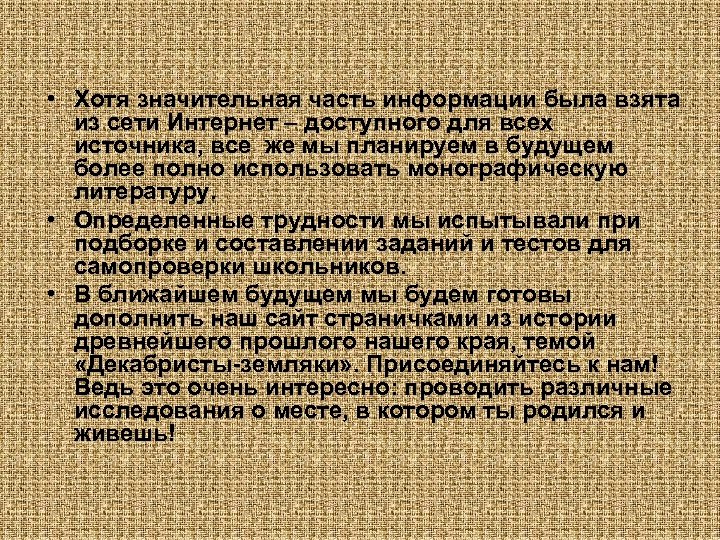 • Хотя значительная часть информации была взята из сети Интернет – доступного для всех источника, все же мы планируем в будущем более полно использовать монографическую литературу. • Определенные трудности мы испытывали при подборке и составлении заданий и тестов для самопроверки школьников. • В ближайшем будущем мы будем готовы дополнить наш сайт страничками из истории древнейшего прошлого нашего края, темой «Декабристы-земляки» . Присоединяйтесь к нам! Ведь это очень интересно: проводить различные исследования о месте, в котором ты родился и живешь!