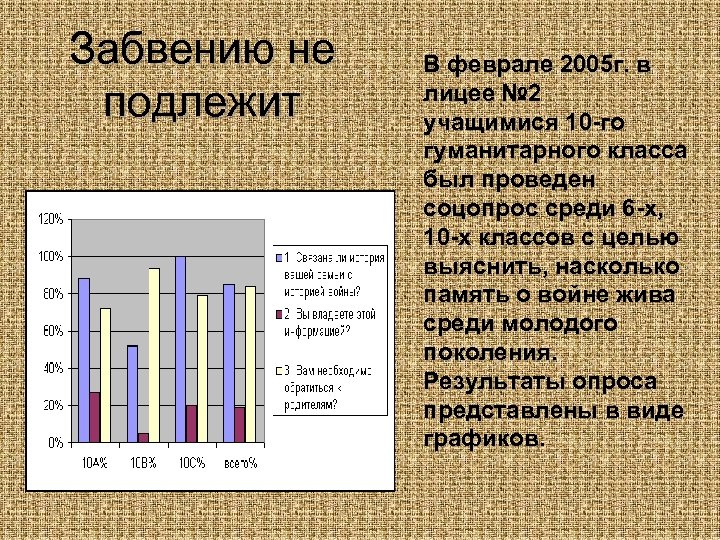 Забвению не подлежит В феврале 2005 г. в лицее № 2 учащимися 10 -го гуманитарного класса был проведен соцопрос среди 6 -х, 10 -х классов с целью выяснить, насколько память о войне жива среди молодого поколения. Результаты опроса представлены в виде графиков.