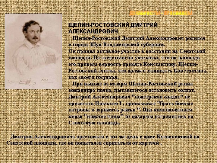 ЩЕПИН-РОСТОВСКИЙ ДМИТРИЙ АЛЕКСАНДРОВИЧ Щепин-Ростовский Дмитрий Александрович родился в городе Шуя Владимирской губернии. Он принял активное участие в восстании на Сенатской площади. На следствии он указывал, что на площадь его привела верность присяге Константину. Щепин. Ростовский считал, что должен защищать Константина, как своего государя. При выходе из казарм Щепин-Ростовский ранил командира полка, пытавшегося остановить солдат. Дмитрий Александрович "подстрекая солдат" не присягать Николаю I , приказывал "брать боевые патроны и зарижать режья ". Под командованием князя "нижние чины" из казармы устремились на Сенатскую площадь. Дмитрия Александровича арестовали в тот же день в доме Кусовниковой на Сенатской площади, где он попытался спрятаться от картечи.