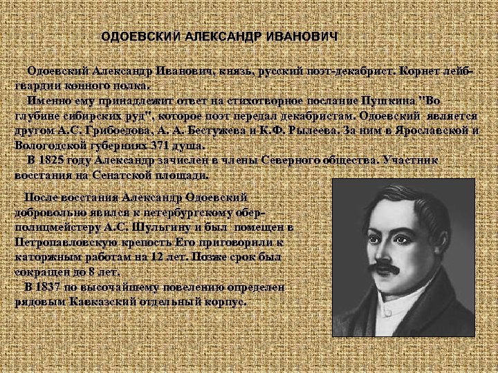 ОДОЕВСКИЙ АЛЕКСАНДР ИВАНОВИЧ Одоевский Александр Иванович, князь, русский поэт-декабрист. Корнет лейбгвардии конного полка. Именно ему принадлежит ответ на стихотворное послание Пушкина "Во глубине сибирских руд", которое поэт передал декабристам. Одоевский является другом А. С. Грибоедова, А. А. Бестужева и К. Ф. Рылеева. За ним в Ярославской и Вологодской губерниях 371 душа. В 1825 году Александр зачислен в члены Северного общества. Участник восстания на Сенатской площади. После восстания Александр Одоевский добровольно явился к петербургскому оберполицмейстеру А. С. Шульгину и был помещен в Петропавловскую крепость Его приговорили к каторжным работам на 12 лет. Позже срок был сокращен до 8 лет. В 1837 по высочайшему повелению определен рядовым Кавказский отдельный корпус.