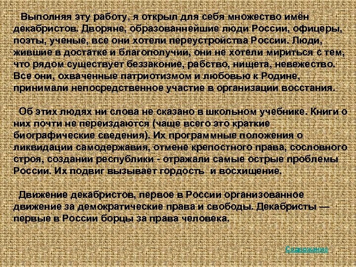Выполняя эту работу, я открыл для себя множество имён декабристов. Дворяне, образованнейшие люди России, офицеры, поэты, ученые, все они хотели переустройства России. Люди, жившие в достатке и благополучии, они не хотели мириться с тем, что рядом существует беззаконие, рабство, нищета, невежество. Все они, охваченные патриотизмом и любовью к Родине, принимали непосредственное участие в организации восстания. Об этих людях ни слова не сказано в школьном учебнике. Книги о них почти не переиздаются (чаще всего это краткие биографические сведения). Их программные положения о ликвидации самодержавия, отмене крепостного права, сословного строя, создании республики - отражали самые острые проблемы России. Их подвиг вызывает гордость и восхищение. Движение декабристов, первое в России организованное движение за демократические права и свободы. Декабристы — первые в России борцы за права человека. Содержание