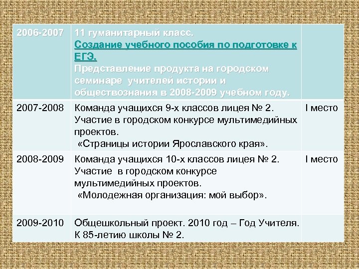 2006 -2007 11 гуманитарный класс. Создание учебного пособия по подготовке к ЕГЭ. Представление продукта на городском семинаре учителей истории и обществознания в 2008 -2009 учебном году. 2007 -2008 Команда учащихся 9 -х классов лицея № 2. I место Участие в городском конкурсе мультимедийных проектов. «Страницы истории Ярославского края» . 2008 -2009 Команда учащихся 10 -х классов лицея № 2. Участие в городском конкурсе мультимедийных проектов. «Молодежная организация: мой выбор» . 2009 -2010 Общешкольный проект. 2010 год – Год Учителя. К 85 -летию школы № 2. I место