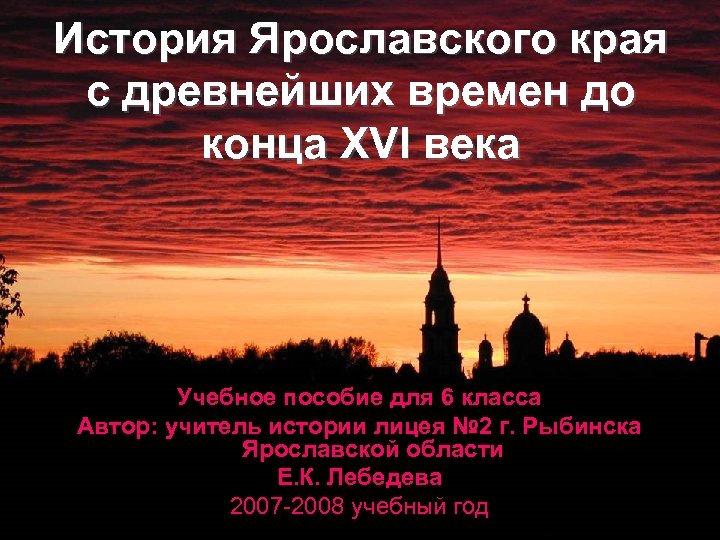 История Ярославского края с древнейших времен до конца XVI века Учебное пособие для 6 класса Автор: учитель истории лицея № 2 г. Рыбинска Ярославской области Е. К. Лебедева 2007 -2008 учебный год