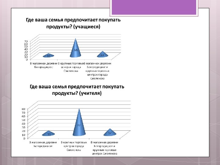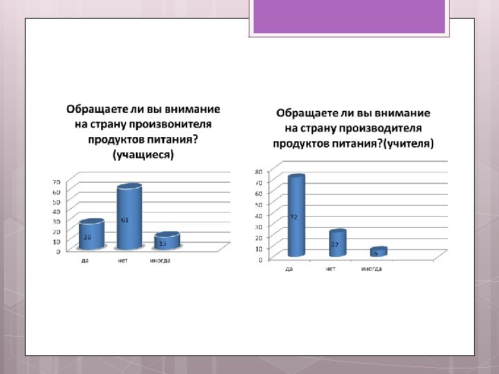 Анкетирование школьников и учителей, анализ результатов. Социологический опрос учителей и учащихся МБОУ Богородицкая СШ был проведен по следующим вопросам: 1. Обращаете ли вы внимание на страну-изготовителя при покупке продуктов? 2. Продукты из каких стран есть в вашем холодильнике? 3. Если у вас есть выбор, какой продукт вы приобретете – отечественный или импортный? 4. Где ваша семья предпочитает покупать продукты? В анкетировании приняли участие 18 учителей и 54 учащихся.