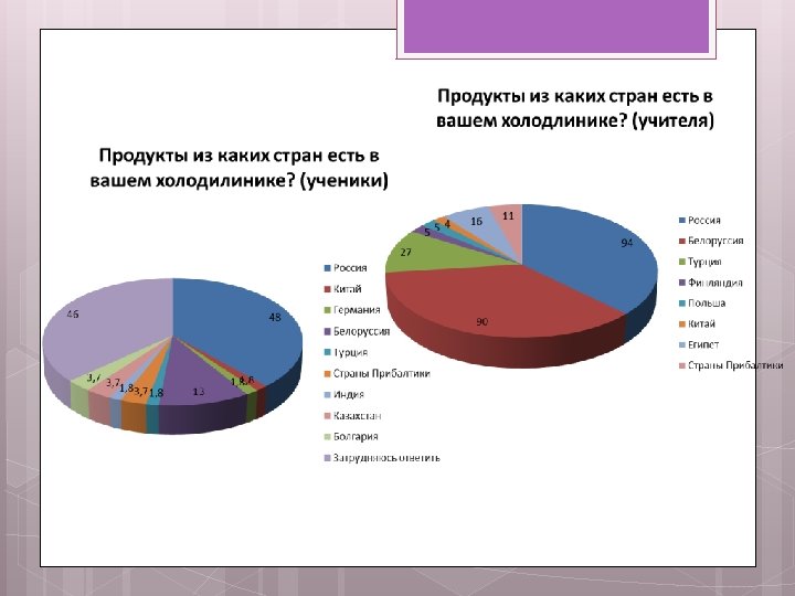 Цель: Определить географию продуктов хранящихся в домашнем холодильнике и выявить долю продуктов отечественного производства. Гипотеза исследования: География большинства продуктов моего холодильника имеет российское происхождение.