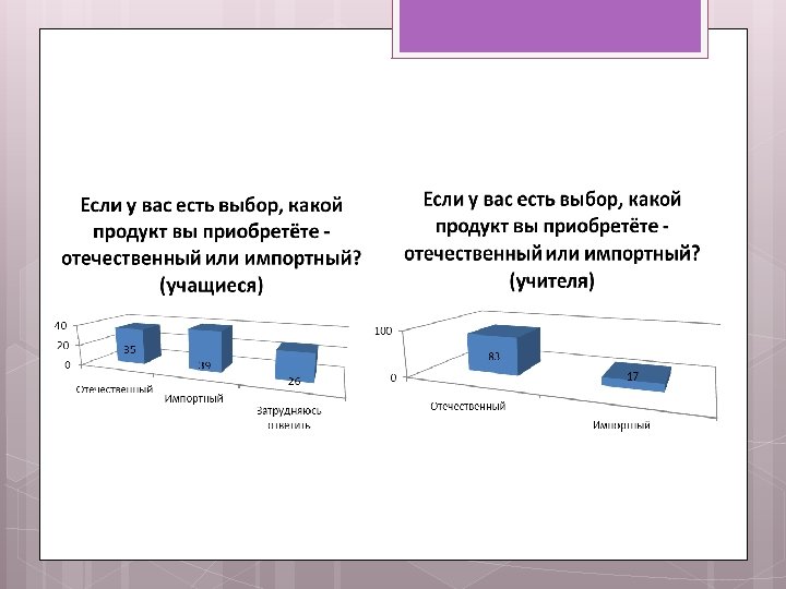Выводы 1. По результатам опроса школьников и учителей, можно сказать, что доля продуктов российского производства преобладает (48 -94%) - гипотеза моего исследования подтверждена. Взрослое население больше отдает предпочтение отечественным продуктам, чем подрастающее. Это может быть связано с большим количеством рекламы импортных продуктов. В связи с этим нужно активизировать работу с детьми по пропаганде здорового образа жизни и употреблению отечественных продуктов. 2. У нас есть выбор: покупать отечественные продукты и поддерживать отечественного производителя или покупать импортное, с большим количеством различных добавок, красителей и ГМО продуктов и подрывать собственное здоровье за свои же деньги. Выбор за вами!