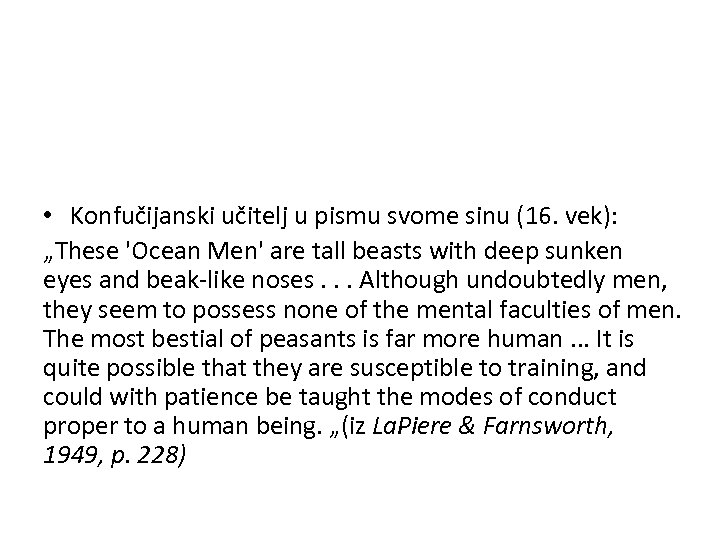 • Konfučijanski učitelj u pismu svome sinu (16. vek): „These 'Ocean Men' are tall beasts with deep sunken eyes and beak-like noses. . . Although undoubtedly men, they seem to possess none of the mental faculties of men. The most bestial of peasants is far more human. . . It is quite possible that they are susceptible to training, and could with patience be taught the modes of conduct proper to a human being. „(iz La. Piere & Farnsworth, 1949, p. 228)
