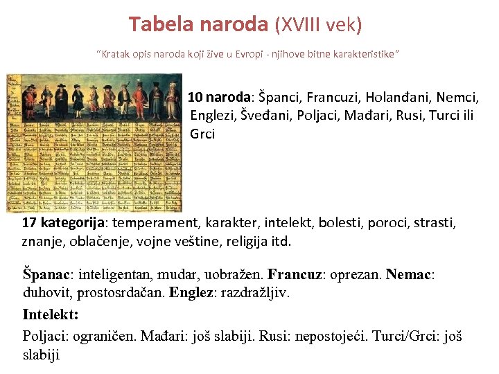 Tabela naroda (XVIII vek) “Kratak opis naroda koji žive u Evropi - njihove bitne karakteristike” 10 naroda: Španci, Francuzi, Holanđani, Nemci, Englezi, Šveđani, Poljaci, Mađari, Rusi, Turci ili Grci 17 kategorija: temperament, karakter, intelekt, bolesti, poroci, strasti, znanje, oblačenje, vojne veštine, religija itd. Španac: inteligentan, mudar, uobražen. Francuz: oprezan. Nemac: duhovit, prostosrdačan. Englez: razdražljiv. Intelekt: Poljaci: ograničen. Mađari: još slabiji. Rusi: nepostojeći. Turci/Grci: još slabiji
