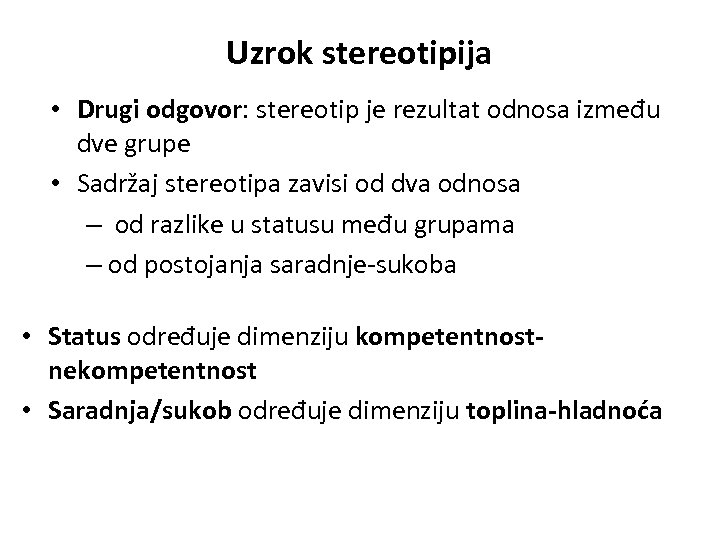 Uzrok stereotipija • Drugi odgovor: stereotip je rezultat odnosa između dve grupe • Sadržaj stereotipa zavisi od dva odnosa – od razlike u statusu među grupama – od postojanja saradnje-sukoba • Status određuje dimenziju kompetentnostnekompetentnost • Saradnja/sukob određuje dimenziju toplina-hladnoća