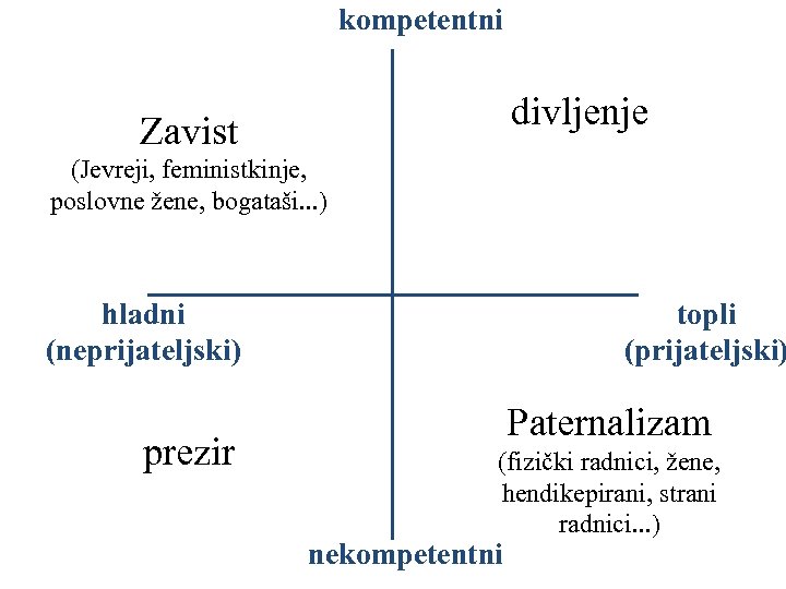 kompetentni divljenje Zavist (Jevreji, feministkinje, poslovne žene, bogataši. . . ) hladni (neprijateljski) prezir topli (prijateljski) Paternalizam (fizički radnici, žene, hendikepirani, strani radnici. . . ) nekompetentni