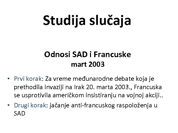 Studija slučaja Odnosi SAD i Francuske mart 2003 • Prvi korak: Za vreme međunarodne debate koja je prethodila invaziji na Irak 20. marta 2003. , Francuska se usprotivila američkom insistiranju na vojnoj akciji. . • Drugi korak: jačanje anti-francuskog raspoloženja u SAD