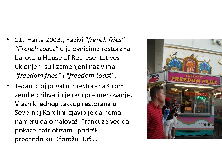 • 11. marta 2003. , nazivi "french fries" i “French toast" u jelovnicima restorana i barova u House of Representatives uklonjeni su i zamenjeni nazivima "freedom fries“ i “freedom toast”. • Jedan broj privatnih restorana širom zemlje prihvatio je ovo preimenovanje. Vlasnik jednog takvog restorana u Severnoj Karolini izjavio je da nema nameru da omalovaži Francuze već da pokaže patriotizam i podršku predsedniku Džordžu Bušu.