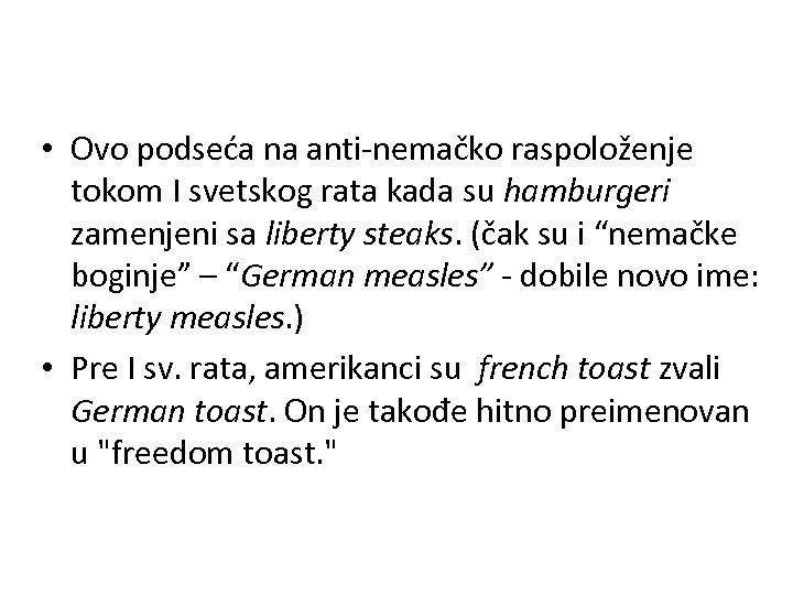 • Ovo podseća na anti-nemačko raspoloženje tokom I svetskog rata kada su hamburgeri zamenjeni sa liberty steaks. (čak su i “nemačke boginje” – “German measles” - dobile novo ime: liberty measles. ) • Pre I sv. rata, amerikanci su french toast zvali German toast. On je takođe hitno preimenovan u "freedom toast. "