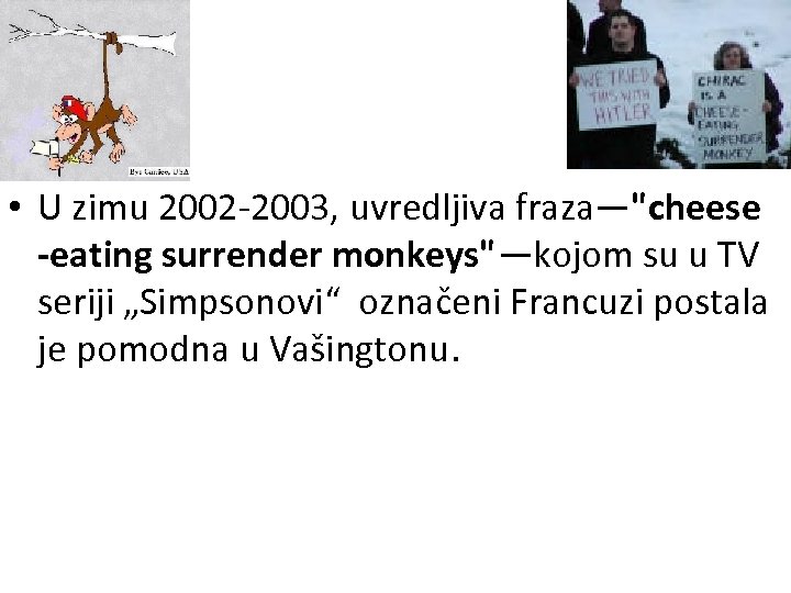 • U zimu 2002 -2003, uvredljiva fraza—"cheese -eating surrender monkeys"—kojom su u TV seriji „Simpsonovi“ označeni Francuzi postala je pomodna u Vašingtonu.