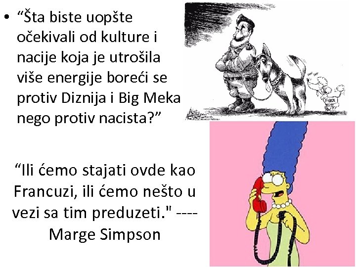 • “Šta biste uopšte očekivali od kulture i nacije koja je utrošila više energije boreći se protiv Diznija i Big Meka nego protiv nacista? ” “Ili ćemo stajati ovde kao Francuzi, ili ćemo nešto u vezi sa tim preduzeti. " ---Marge Simpson