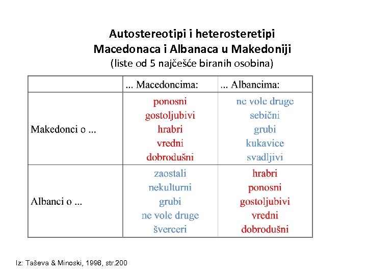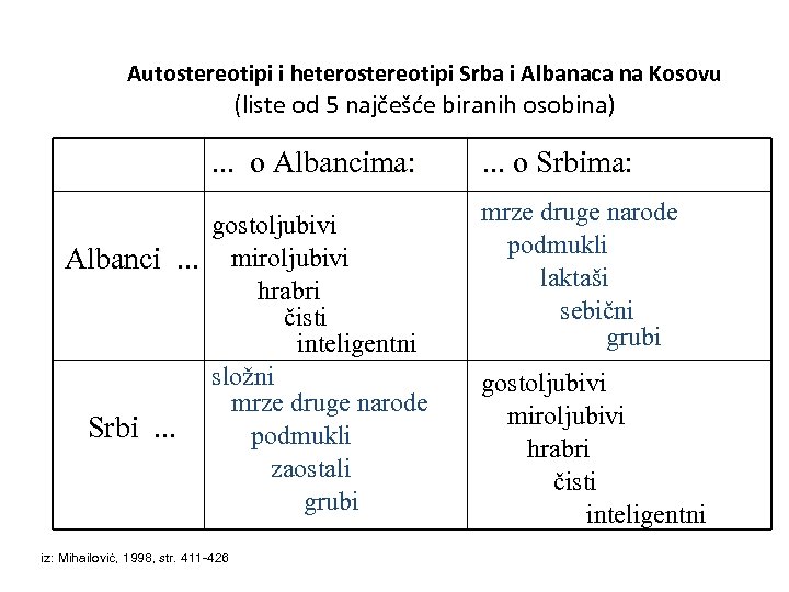 Autostereotipi i heterostereotipi Srba i Albanaca na Kosovu (liste od 5 najčešće biranih osobina) . . . o Albancima: gostoljubivi Albanci. . . miroljubivi hrabri čisti inteligentni složni mrze druge narode Srbi. . . podmukli zaostali grubi iz: Mihailović, 1998, str. 411 -426 . . . o Srbima: mrze druge narode podmukli laktaši sebični grubi gostoljubivi miroljubivi hrabri čisti inteligentni