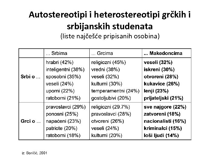 Autostereotipi i heterostereotipi grčkih i srbijanskih studenata (liste najčešće pripisanih osobina) iz: Boričić, 2001