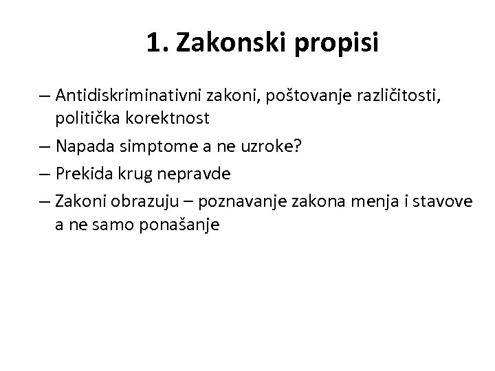 1. Zakonski propisi – Antidiskriminativni zakoni, poštovanje različitosti, politička korektnost – Napada simptome a ne uzroke? – Prekida krug nepravde – Zakoni obrazuju – poznavanje zakona menja i stavove a ne samo ponašanje