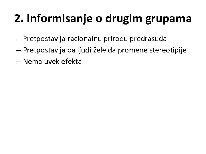2. Informisanje o drugim grupama – Pretpostavlja racionalnu prirodu predrasuda – Pretpostavlja da ljudi žele da promene stereotipije – Nema uvek efekta
