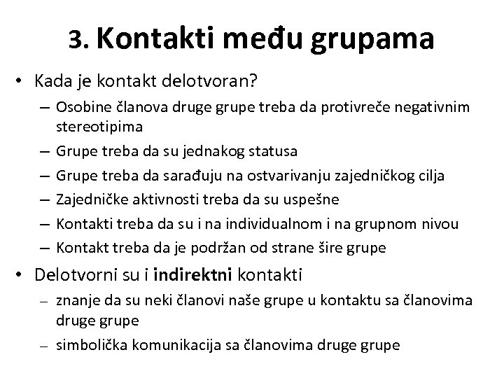 3. Kontakti među grupama • Kada je kontakt delotvoran? – Osobine članova druge grupe treba da protivreče negativnim stereotipima – Grupe treba da su jednakog statusa – Grupe treba da sarađuju na ostvarivanju zajedničkog cilja – Zajedničke aktivnosti treba da su uspešne – Kontakti treba da su i na individualnom i na grupnom nivou – Kontakt treba da je podržan od strane šire grupe • Delotvorni su i indirektni kontakti – – znanje da su neki članovi naše grupe u kontaktu sa članovima druge grupe simbolička komunikacija sa članovima druge grupe