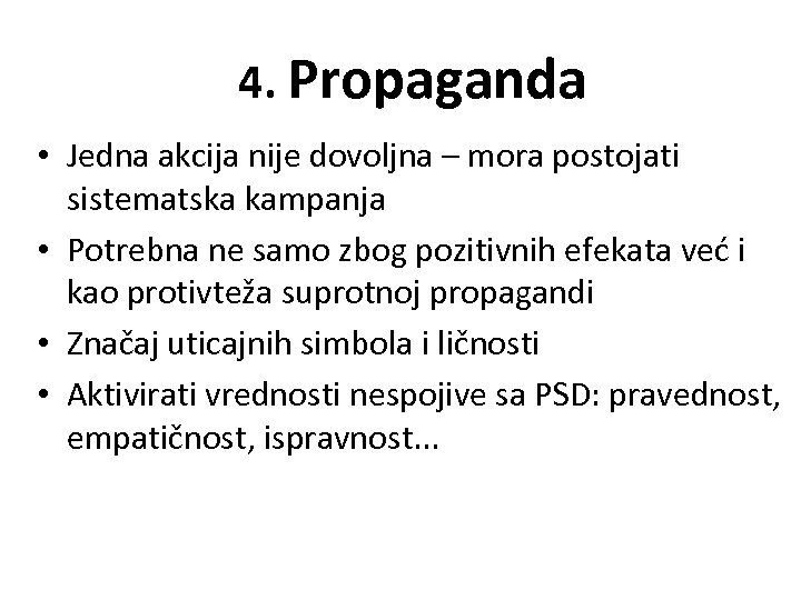 4. Propaganda • Jedna akcija nije dovoljna – mora postojati sistematska kampanja • Potrebna ne samo zbog pozitivnih efekata već i kao protivteža suprotnoj propagandi • Značaj uticajnih simbola i ličnosti • Aktivirati vrednosti nespojive sa PSD: pravednost, empatičnost, ispravnost. . .