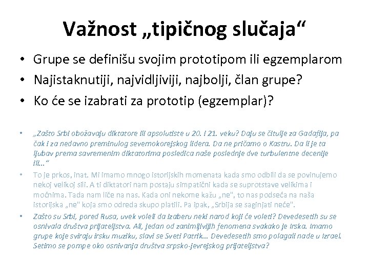 Važnost „tipičnog slučaja“ • Grupe se definišu svojim prototipom ili egzemplarom • Najistaknutiji, najvidljiviji, najbolji, član grupe? • Ko će se izabrati za prototip (egzemplar)? • • • „Zašto Srbi obožavaju diktatore ili apsolutiste u 20. i 21. veku? Daju se čitulje za Gadafija, pa čak i za nedavno preminulog severnokorejskog lidera. Da ne pričamo o Kastru. Da li je ta ljubav prema savremenim diktatorima posledica naše poslednje dve turbulentne decenije ili. . . “ To je prkos, inat. Mi imamo mnogo istorijskih momenata kada smo odbili da se povinujemo nekoj velikoj sili. A ti diktatori nam postaju simpatični kada se suprotstave velikima i moćnima. Tada nam liče na nas. Kada oni nekome kažu „ne", to nas podseća na naša istorijska „ne" koja smo odreda skupo platili. Pa ipak, „Srbija se saginjati neće". Zašto su Srbi, pored Rusa, uvek voleli da izaberu neki narod koji će voleti? Devedesetih su se osnivala društva prijateljstva. Ali, jedan od zanimljivijih fenomena svakako je Irska. Imamo grupe koje sviraju irsku muziku, slavi se Sveti Patrik. . . Devedesetih smo polagali nade u Izrael. Setimo se pompe oko osnivanja društva srpsko-jevrejskog prijateljstva?