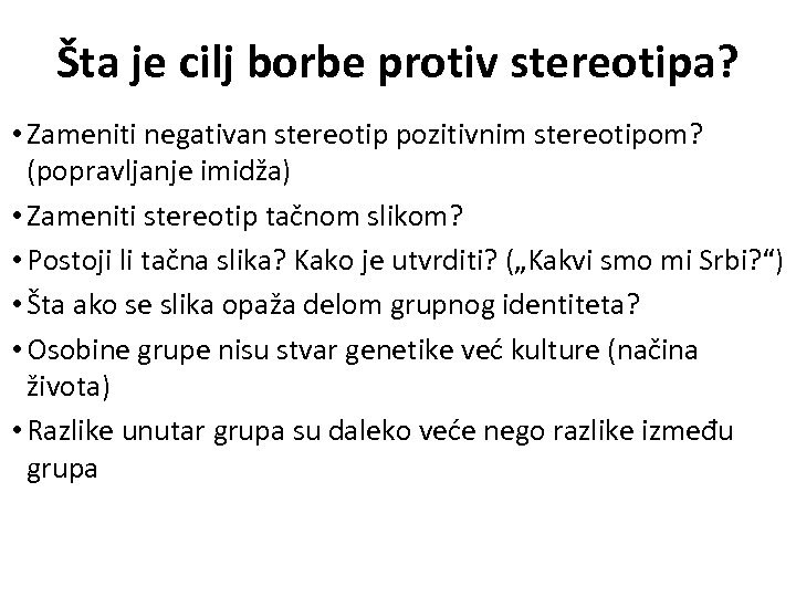 Šta je cilj borbe protiv stereotipa? • Zameniti negativan stereotip pozitivnim stereotipom? (popravljanje imidža) • Zameniti stereotip tačnom slikom? • Postoji li tačna slika? Kako je utvrditi? („Kakvi smo mi Srbi? “) • Šta ako se slika opaža delom grupnog identiteta? • Osobine grupe nisu stvar genetike već kulture (načina života) • Razlike unutar grupa su daleko veće nego razlike između grupa