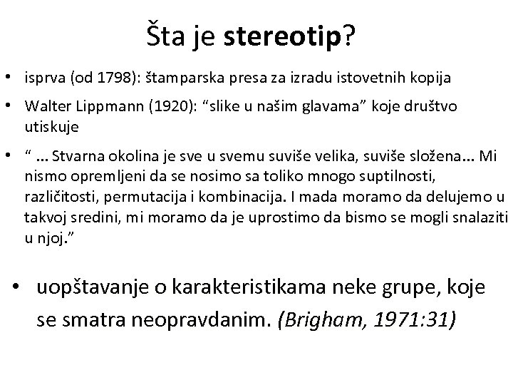 Šta je stereotip? • isprva (od 1798): štamparska presa za izradu istovetnih kopija • Walter Lippmann (1920): “slike u našim glavama” koje društvo utiskuje • “. . . Stvarna okolina je sve u svemu suviše velika, suviše složena. . . Mi nismo opremljeni da se nosimo sa toliko mnogo suptilnosti, različitosti, permutacija i kombinacija. I mada moramo da delujemo u takvoj sredini, mi moramo da je uprostimo da bismo se mogli snalaziti u njoj. ” • uopštavanje o karakteristikama neke grupe, koje se smatra neopravdanim. (Brigham, 1971: 31)