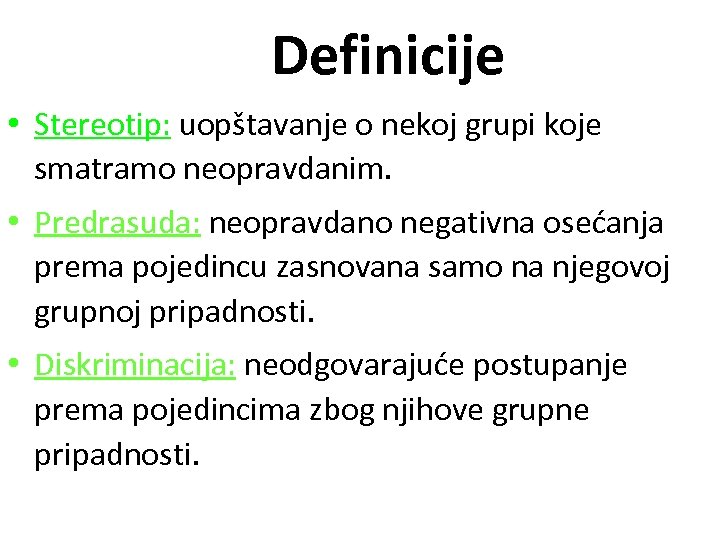 Definicije • Stereotip: uopštavanje o nekoj grupi koje smatramo neopravdanim. • Predrasuda: neopravdano negativna osećanja prema pojedincu zasnovana samo na njegovoj grupnoj pripadnosti. • Diskriminacija: neodgovarajuće postupanje prema pojedincima zbog njihove grupne pripadnosti.
