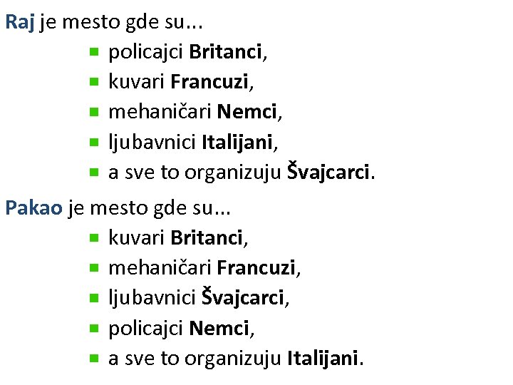 Raj je mesto gde su. . . policajci Britanci, kuvari Francuzi, mehaničari Nemci, ljubavnici Italijani, a sve to organizuju Švajcarci. Pakao je mesto gde su. . . kuvari Britanci, mehaničari Francuzi, ljubavnici Švajcarci, policajci Nemci, a sve to organizuju Italijani.
