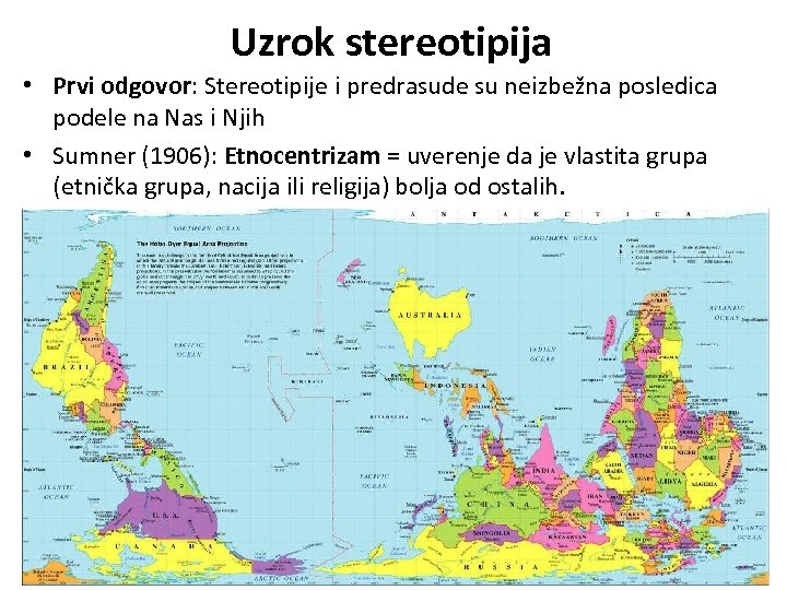 Uzrok stereotipija • Prvi odgovor: Stereotipije i predrasude su neizbežna posledica podele na Nas i Njih • Sumner (1906): Etnocentrizam = uverenje da je vlastita grupa (etnička grupa, nacija ili religija) bolja od ostalih.