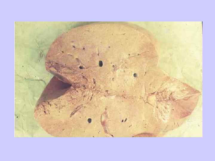 Исходы жировой дистрофии печени • Обратное развитие изменений после удаления причинного фактора легкой степени • При постоянном длительном воздействии причинного фактора умеренной степени – постоянная гибель клеток с развитием на их месте соединительной ткани – фиброз и цирроз печени • При воздействии повреждающих факторов тяжелой степени – массивный жировой некроз ткани печени с развитием печеночной недостаточности.