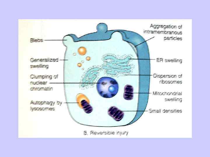 Набухание и разрушение митохондрий; Распад мембран эндоплазматического ретикулума с формированием миелиновых фигур; Нарушение синтеза белка – уменьшение числа рибосом; Изменения цитоплазматической мембраны в виде выпячиваний, вакуолей, разрывов, появления складок, нарушения межклеточных контактов. Накопление в клетке воды с разрывом мембран; Освобождение митохондриального кальция: Частичный коагуляционный некроз органелл Частичный колликвационный некроз органелд * • •