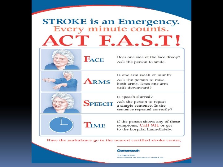 Medications Anti-coagulants – A fib & TIA Antithrombotics Calcium channel blockers – Nimotop (nimodipine) Corticosteroids ? ? ? Diuretics – Mannitol, Lasix (Furosemide) Anticonvulsants – Dilantin (phenytoin) or Cerebyx (Fosphenytoin Sodium Injection) Thrombolytics - t. PA (recombinant tissue plasminogen activator)