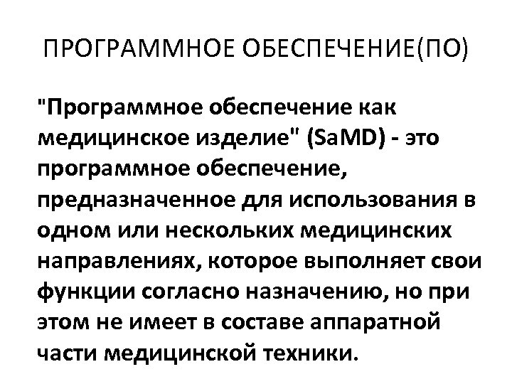 ПРОГРАММНОЕ ОБЕСПЕЧЕНИЕ(ПО) "Программное обеспечение как медицинское изделие" (Sa. MD) - это программное обеспечение, предназначенное для использования в одном или нескольких медицинских направлениях, которое выполняет свои функции согласно назначению, но при этом не имеет в составе аппаратной части медицинской техники.