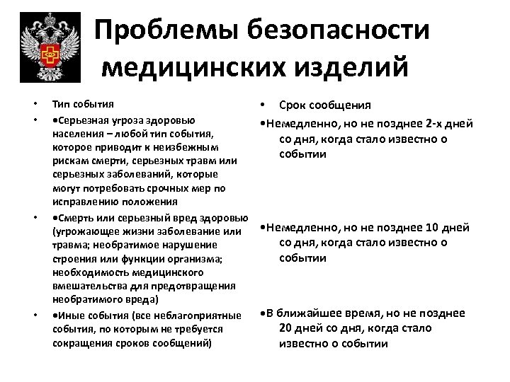Проблемы безопасности медицинских изделий • • Тип события • Серьезная угроза здоровью населения – любой тип события, которое приводит к неизбежным рискам смерти, серьезных травм или серьезных заболеваний, которые могут потребовать срочных мер по исправлению положения • Смерть или серьезный вред здоровью (угрожающее жизни заболевание или травма; необратимое нарушение строения или функции организма; необходимость медицинского вмешательства для предотвращения необратимого вреда) • Иные события (все неблагоприятные события, по которым не требуется сокращения сроков сообщений) • Срок сообщения • Немедленно, но не позднее 2 -х дней со дня, когда стало известно о событии • Немедленно, но не позднее 10 дней со дня, когда стало известно о событии • В ближайшее время, но не позднее 20 дней со дня, когда стало известно о событии