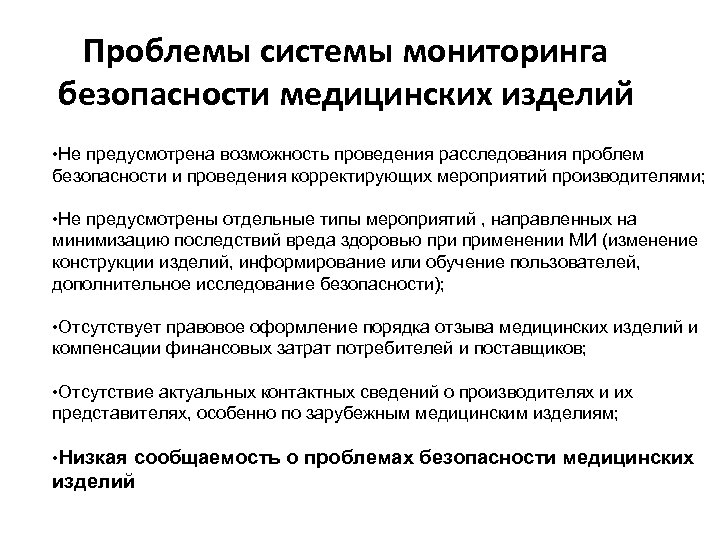 Проблемы системы мониторинга безопасности медицинских изделий • Не предусмотрена возможность проведения расследования проблем безопасности и проведения корректирующих мероприятий производителями; • Не предусмотрены отдельные типы мероприятий , направленных на минимизацию последствий вреда здоровью применении МИ (изменение конструкции изделий, информирование или обучение пользователей, дополнительное исследование безопасности); • Отсутствует правовое оформление порядка отзыва медицинских изделий и компенсации финансовых затрат потребителей и поставщиков; • Отсутствие актуальных контактных сведений о производителях и их представителях, особенно по зарубежным медицинским изделиям; • Низкая сообщаемость о проблемах безопасности медицинских изделий