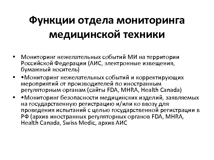 Функции отдела мониторинга медицинской техники • Мониторинг нежелательных событий МИ на территории Российской Федерации (АИС, электронные извещения, бумажный носитель) • • Мониторинг нежелательных событий и корректирующих мероприятий от производителей по иностранным регуляторным органам (сайты FDA, MHRA, Health Canada) • • Мониторинг безопасности медицинских изделий, заявляемых на государственную регистрацию и/или ко ввозу для проведения испытаний с целью государственной регистрации в РФ (архив иностранных регуляторных органов FDA, MHRA, Health Canada, Swiss Medic, архив АИС