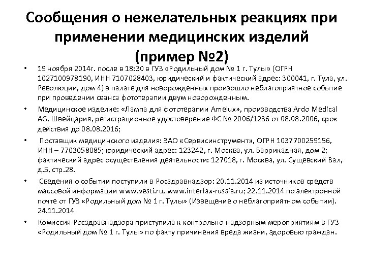 Сообщения о нежелательных реакциях применении медицинских изделий (пример № 2) • • • 19 ноября 2014 г. после в 18: 30 в ГУЗ «Родильный дом № 1 г. Тулы» (ОГРН 1027100978190, ИНН 7107028403, юридический и фактический адрес: 300041, г. Тула, ул. Революции, дом 4) в палате для новорожденных произошло неблагоприятное событие при проведении сеанса фототерапии двум новорожденным. Медицинское изделие: «Лампа для фототерапии Amelux» , производства Ardo Medical AG, Швейцария, регистрационное удостоверение ФС № 2006/1236 от 08. 2006, срок действия до 08. 2016; Поставщик медицинского изделия: ЗАО «Сервисинструмент» , ОГРН 1037700259156, ИНН – 7703058085; юридический адрес: 123242, г. Москва, ул. Баррикадная, дом 2; фактический адрес осуществления деятельности: 127018, г. Москва, ул. Сущевский Вал, д. 5, стр. 28. Сведения о событии поступили в Росздравнадзор: 20. 11. 2014 из источников средств массовой информации www. vesti. ru, www. interfax-russia. ru; 22. 11. 2014 по электронной почте от ГУЗ «Родильный дом № 1 г. Тулы» (Извещение о неблагоприятном событии). 24. 11. 2014 Комиссия Росздравнадзора приступила к контрольно-надзорным мероприятиям в ГУЗ «Родильный дом № 1 г. Тулы» по факту причинения вреда жизни, здоровью граждан.