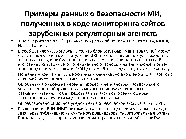 • • • Примеры данных о безопасности МИ, полученных в ходе мониторинга сайтов зарубежных регуляторных агентств 1. МРТ производства GE (11 моделей) по сообщениям на сайтах FDA, MHRA, Health Canada: В сообщениях указывалось на то, что блок остановки магнитов (MRU) может быть не подключен к магниту. Если MRU отсоединен, он не будет работать, как ожидалось, и не будет останавливать магнит при нажатии кнопки. В экстренных ситуациях это потенциально опасно для жизни и может привести к повреждениям и травмам. MRU должен быть всегда подключен к магниту. По данным компании GE в Российских клиниках установлено 240 аппаратов с системой экстренного размагничивания. GE объявила о своем намерении провести неплановую проверку всего установленного оборудования, имеющего систему экстренного размагничивания, чтобы предотвратить риск повторения ошибки использования техники медицинским персоналом. GE разработано «Срочное уведомление о безопасной эксплуатации МРТ» В заключении ВНИИИМТ рекомендовано срочно довести уведомление до ЛПУ через публикацию на сайте Росздравнадзора, территориальные органы Росздравнадзора и органы управления здравоохранения субъектов РФ.