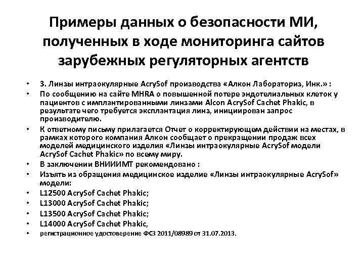 Примеры данных о безопасности МИ, полученных в ходе мониторинга сайтов зарубежных регуляторных агентств • • • 3. Линзы интраокулярные Acry. Sof производства «Алкон Лабораториз, Инк. » : По сообщению на сайте MHRA о повышенной потере эндотелиальных клеток у пациентов с имплантированными линзами Alcon Acry. Sof Cachet Phakic, в результате чего требуется эксплантация линз, инициирован запрос производителю. К ответному письму прилагается Отчет о корректирующем действии на местах, в рамках которого компания Алкон сообщает о прекращении продаж всех моделей медицинского изделия «Линзы интраокулярные Acry. Sof модели Acry. Sof Cachet Phakic» по всему миру. В заключении ВНИИИМТ рекомендовано : Изъять из обращения медицинское изделие «Линзы интраокулярные Acry. Sof» модели: L 12500 Acry. Sof Cachet Phakic; L 13000 Acry. Sof Cachet Phakic; L 13500 Acry. Sof Cachet Phakic; L 14000 Acry. Sof Cachet Phakic, регистрационное удостоверение ФСЗ 2011/08989 от 31. 07. 2013.