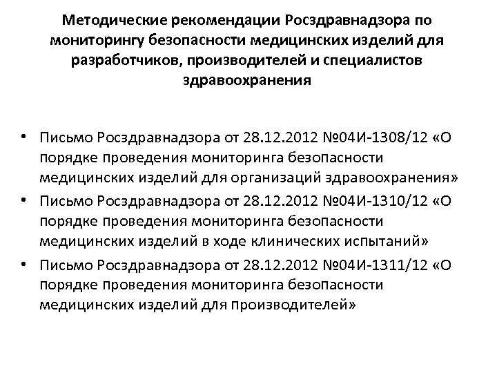 Методические рекомендации Росздравнадзора по мониторингу безопасности медицинских изделий для разработчиков, производителей и специалистов здравоохранения • Письмо Росздравнадзора от 28. 12. 2012 № 04 И-1308/12 «О порядке проведения мониторинга безопасности медицинских изделий для организаций здравоохранения» • Письмо Росздравнадзора от 28. 12. 2012 № 04 И-1310/12 «О порядке проведения мониторинга безопасности медицинских изделий в ходе клинических испытаний» • Письмо Росздравнадзора от 28. 12. 2012 № 04 И-1311/12 «О порядке проведения мониторинга безопасности медицинских изделий для производителей»