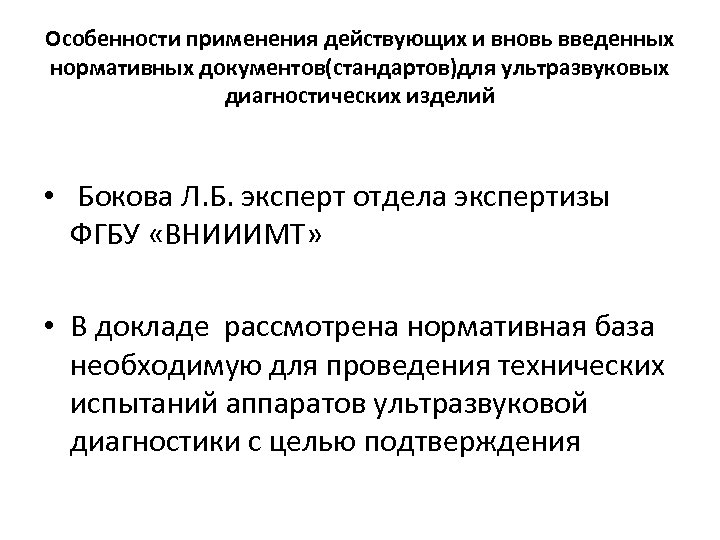 Особенности применения действующих и вновь введенных нормативных документов(стандартов)для ультразвуковых диагностических изделий • Бокова Л. Б. эксперт отдела экспертизы ФГБУ «ВНИИИМТ» • В докладе рассмотрена нормативная база необходимую для проведения технических испытаний аппаратов ультразвуковой диагностики с целью подтверждения