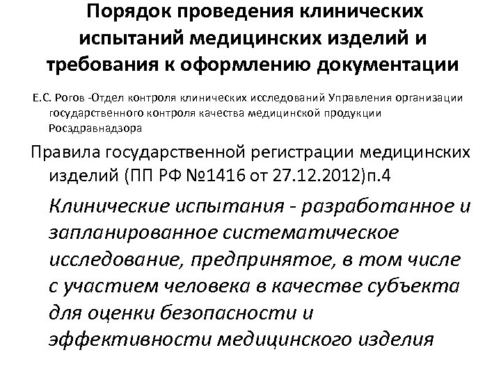 Порядок проведения клинических испытаний медицинских изделий и требования к оформлению документации Е. С. Рогов -Отдел контроля клинических исследований Управления организации государственного контроля качества медицинской продукции Росздравнадзора Правила государственной регистрации медицинских изделий (ПП РФ № 1416 от 27. 12. 2012)п. 4 Клинические испытания - разработанное и запланированное систематическое исследование, предпринятое, в том числе с участием человека в качестве субъекта для оценки безопасности и эффективности медицинского изделия