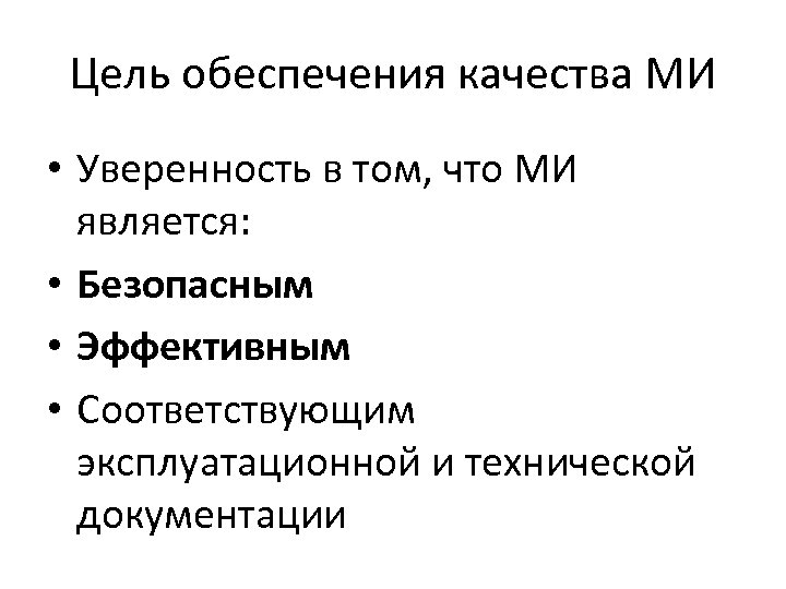 Цель обеспечения качества МИ • Уверенность в том, что МИ является: • Безопасным • Эффективным • Соответствующим эксплуатационной и технической документации