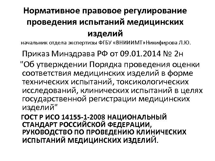 Нормативное правовое регулирование проведения испытаний медицинских изделий начальник отдела экспертизы ФГБУ «ВНИИИМТ» Никифирова Л. Ю. Приказ Минздрава РФ от 09. 01. 2014 № 2 н "Об утверждении Порядка проведения оценки соответствия медицинских изделий в форме технических испытаний, токсикологических исследований, клинических испытаний в целях государственной регистрации медицинских изделий" ГОСТ Р ИСО 14155 -1 -2008 НАЦИОНАЛЬНЫЙ СТАНДАРТ РОССИЙСКОЙ ФЕДЕРАЦИИ, РУКОВОДСТВО ПО ПРОВЕДЕНИЮ КЛИНИЧЕСКИХ ИСПЫТАНИЙ МЕДИЦИНСКИХ ИЗДЕЛИЙ.
