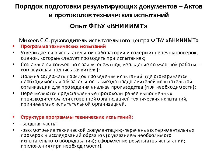 Порядок подготовки результирующих документов – Актов и протоколов технических испытаний Опыт ФГБУ «ВНИИИМТ» • • Михеев С. С. руководитель испытательного центра ФГБУ «ВНИИИМТ» Программа технических испытаний Утверждается в испытательной лаборатории и содержит перечньпроверок, оценок, которые следует проводить при испытаниях; Составляется совместно с заявителем (подтверждение совместной работы – согласующая подпись заявителя); Должна содержать порядок проведения испытаний, где оговаривается необходимость и обязательность выезда представителей испытательной организации для проведения анализа производства (при необходимости); Перечисляются представленные протоколы ранее выполненных производителем или сторонней организацией технических испытаний, принимаемых испытательной организацией. Структура программы технических испытаний: -вводная часть; -рассмотрение технической документации; -перечень экспериментальных проверок и исследований образцов (с указанием необходимого испытательного оборудования); -оформление результатов испытаний; приложения (при необходимости).