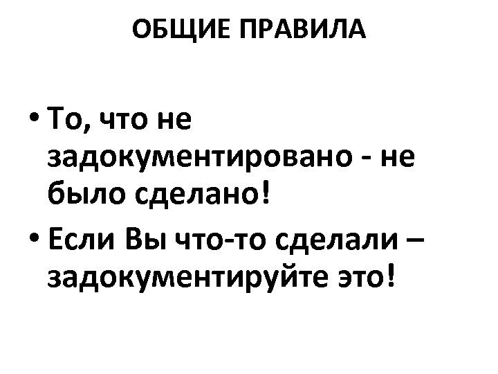 ОБЩИЕ ПРАВИЛА • То, что не задокументировано - не было сделано! • Если Вы что-то сделали – задокументируйте это!