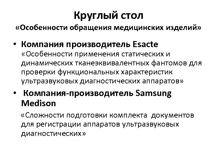 Круглый стол «Особенности обращения медицинских изделий» • Компания производитель Esacte «Особенности применения статических и динамических тканеэквивалентных фантомов для проверки функциональных характеристик ультразвуковых диагностических аппаратов» • Компания-производитель Samsung Medison «Сложности подготовки комплекта документов для регистрации аппаратов ультразвуковых диагностических»